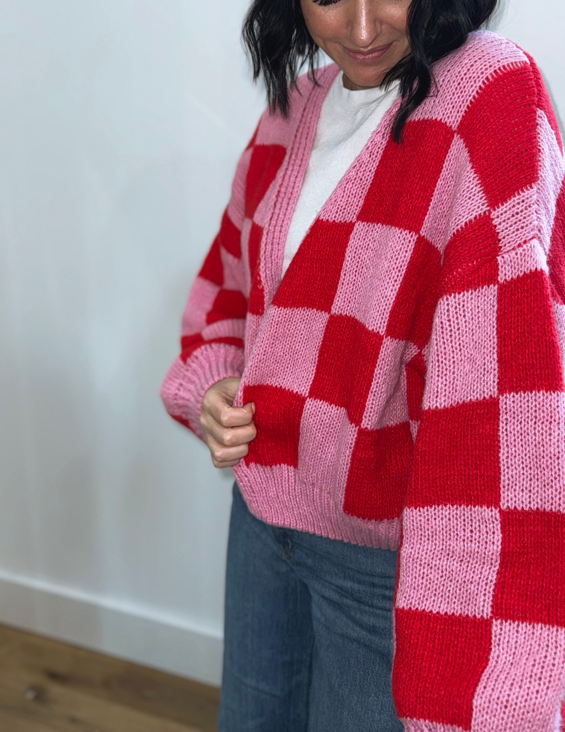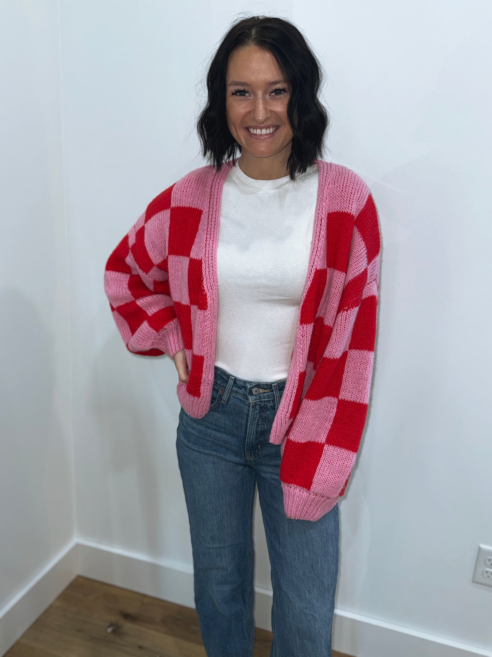 Vibrant pink and red checkerboard pattern for a playful, eye-catching style. Features an oversized fit with stylish balloon sleeves for a trendy, relaxed look.
